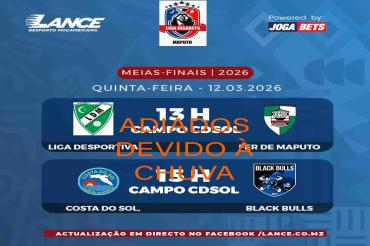 Os jogos das meias-finais do Campeonato Provincial, denominado Liga Jogabets, inicialmente agendados para esta quinta-feira (12 de Março), no Campo do Costa do Sol, foram oficialmente adiados devido às condições climatéricas que se fazem sentir na capital do país.
