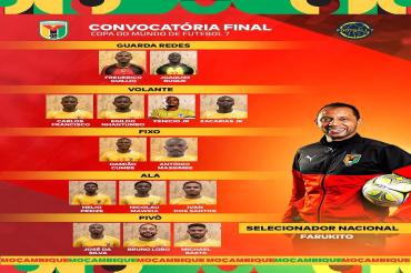 À beira da sua estreia absoluta no Campeonato do Mundo de Futebol 7, o seleccionador nacional, Farukito, divulgou a lista dos 14 jogadores que irão representar a selecção moçambicana da modalidade na competição que decorrerá entre os dias 21 e 24 de Agosto, em Curitiba, Brasil.
